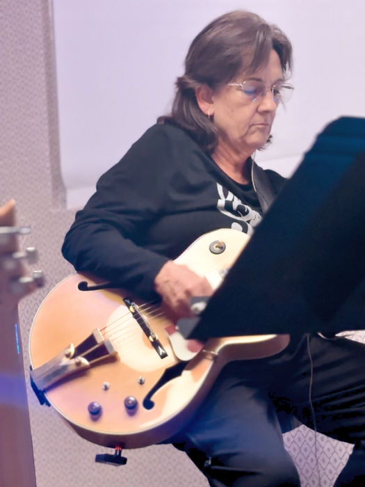 Over a 50-year career, Groovin G has developed a distinctive style rooted in the grooves of the Isley Brothers, Earth, Wind & Fire, Maze, Chaka Khan, and Stevie Wonder, blended with the finesse of her guitar heroes like Nile Rodgers, George Benson, and Norman Brown. What makes her stand out is not only her mastery of rhythm guitar but also her presence as a 63-year-old white female performing soul, funk, and jazz inside an all-Black, all-female ensemble. Her message is simple and powerful: “It’s never too late to do your dream job.”